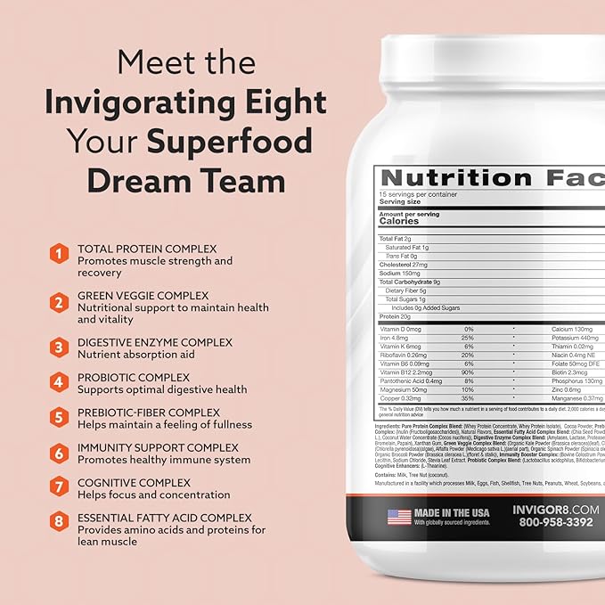 • INVIGOR8 SUPERFOOD SHAKE. Build lean muscle, stay satiated and promote healthy digestion. This delicious triple chocolate brownie shake gives you premium grass-fed whey protein, pre and probiotics, and immunity boosters for health from the inside out
