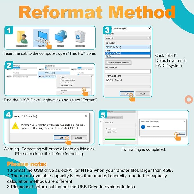 • Default format is FAT32: Please format the drives as exFAT or NTFS when you transfer files larger than 4GB. Reformatting method: connect to the computer - right-click and select format - click Start - done