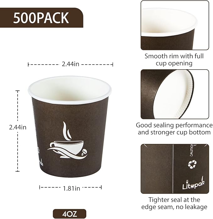 LITOPAK 500 Pack 4 oz Paper Cups, Brown Disposable Hot Coffee Cups for Party, Picnic, Travel, and Events
