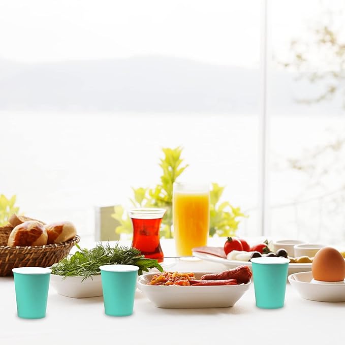 • Wide Range of Uses: Aqua blue paper cups Can be used as coffee cups, juice, beverage cups, DIY ice cream cups. It can also be used to hold food, snacks, etc. It is very suitable for dinner, lunch, parties, barbecues, gatherings, supermarkets, family, offices, and other occasions.