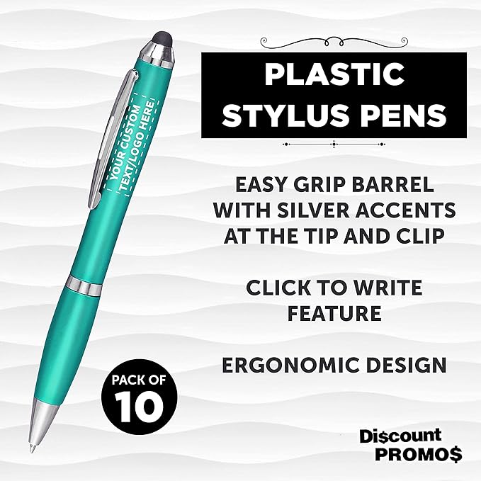 DISCOUNT PROMOS Custom Plastic Stylus Pens Set of 10, Personalized Bulk Pack - Black Ink, Great for Office, School, Business, Tradeshows, Events - Teal