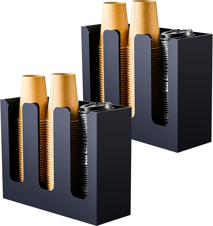 Mumufy 2 Pack 3 Compartments Acrylic Cup Storage Organizer, Disposable Paper Cup Dispenser, Coffee Lid Sleeve Holder for Countertop Restaurant Breakroom Coffee Station Bar Shop Party Supplies