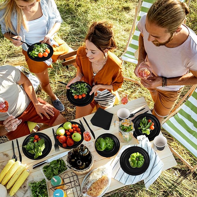 • Black Dinner Items: this set of dinnerware is designed in black, which is simple and elegant, can add a sophisticated feel to your centerpieces, and is ideal for your black-themed parties