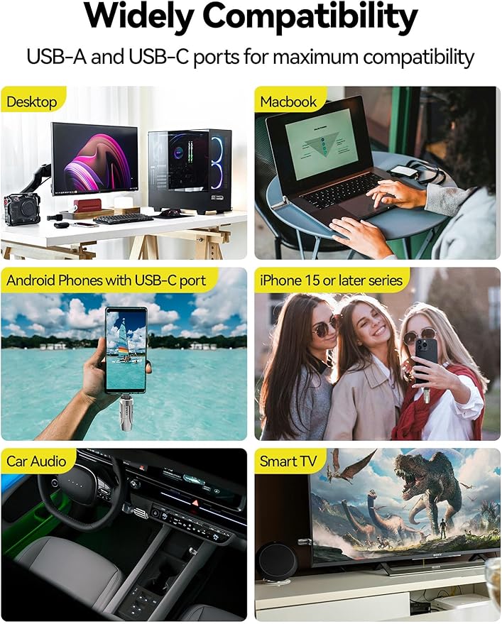 • 【Wide Compatibility and Easy to Use】Universal for iPhone 15 series, iPhone16 series, Android Type-C Phone, desktop, notebook, car audio system, smart TV and More. Plug and Play, extremely simple to use. Plugs directly into your android phone or computer, no cable and software required.
