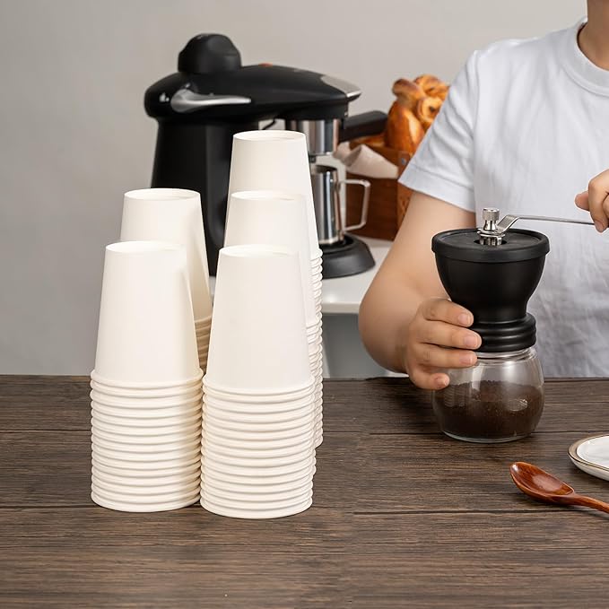 • 8 oz Coffee Cups: This package includes 1000 count 8 oz disposable paper cups, ideal for beverages, juice, and coffee. The tightly rolled rim ensures clean sipping, and the classic white color fits any setting