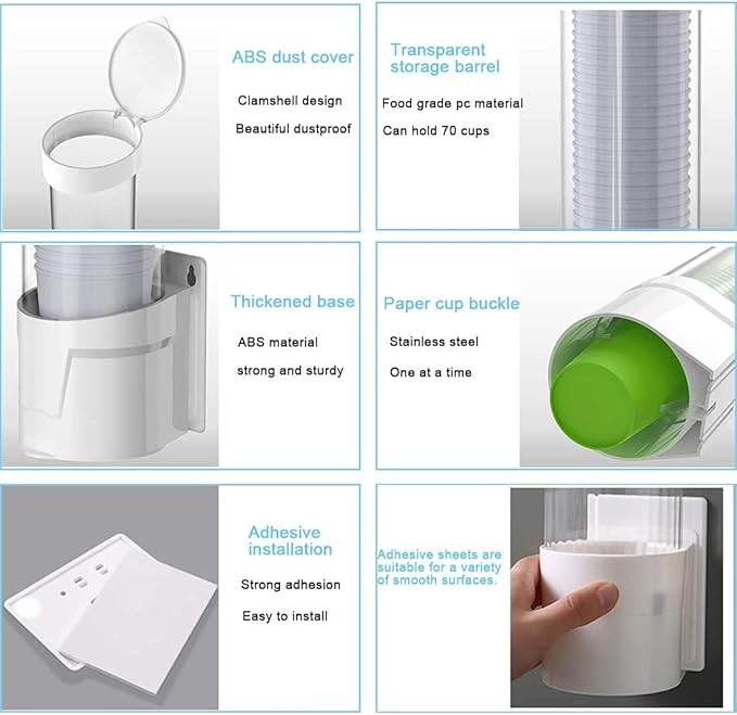 • Easy to Install: There is adhesive tape on the cup dispenser surface, it can be mounted on wall,furniture, everywhere of the water dispenser and any flat surface.Or you can fix it with the screw for easy installation and fixation.