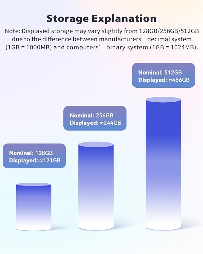 • Compatibility and personal privacy: iPhone usb flash drive is compatible for ios12.1 and above iPhone iPad/OTG Android phone/computer and other USB interface devices. Different from other iphone photo transfer stick, our photo storage also has an encryption function. You can choose specific files to encrypt. Note: Displayed storage may vary slightly from 128GB/256GB/512GB due to the difference between manufacturers' decimal system (1GB = 1000MB) and computers' binary system (1GB = 1024MB).