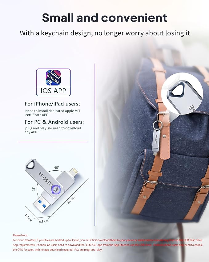 • Reliable after-sales service: Experience the convenience of high-quality USB memory stick and enjoy our premium customer service at the same time. For the lightning flash drive, if you have any questions, we are willing to provide help.(Note: When using a pendrive , iPhone/iPad need to download the "LESOGE" app from the App Store; Android and PC devices can be used directly without downloading any app)