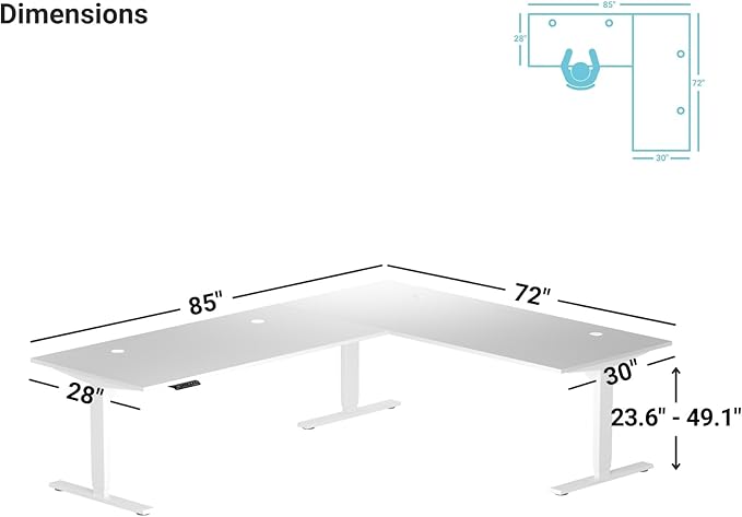 • ELECTRIC HEIGHT ADJUSTABLE CORNER DESK: Accommodate all your office essentials with the expansive furniture and work surface of our 85" x 72" Corner Ryzer L shaped rising desk; Whether it's multiple monitors, a printer, or supplies, this adjustable modern computer standing desk offers ample room to keep everything within reach; This L shaped corner gaming desk is perfect for creating a dedicated gaming or work station in any room; Maximize your productivity with ease