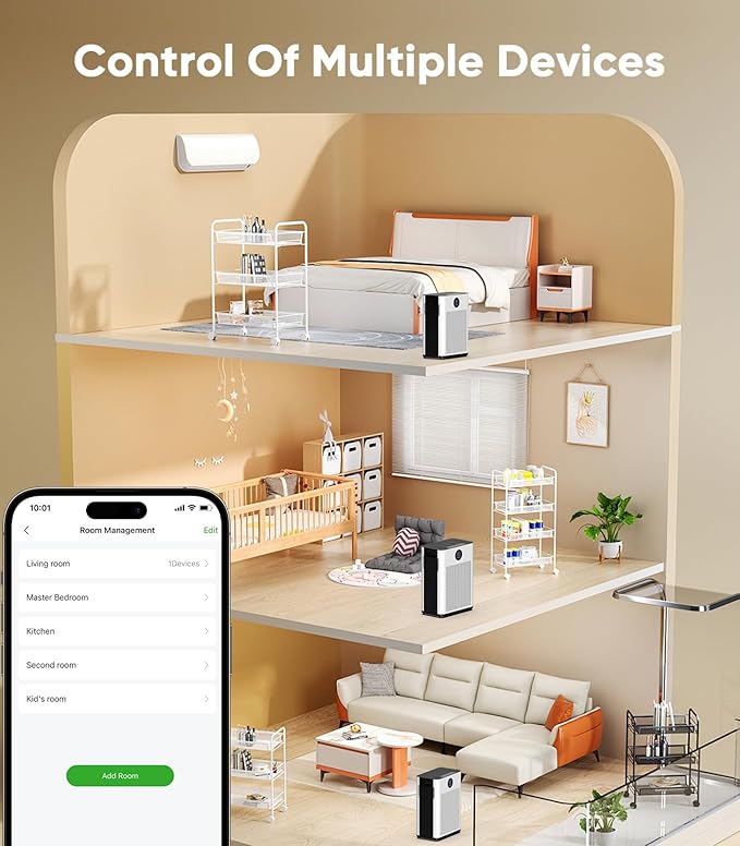 • ๐ŸŒช๏ธ Laser-Precision PM2.5 Tracking | Instant AQI Defense Industry-first infrared laser sensor detects particles as small as 0.3ยตm, with real-time color-coded air quality alerts (Red/Amber/Green). Automatically triggers Turbo Mode during wildfires or pollution spikes, reducing PM2.5 by 90% in 12 minutes.