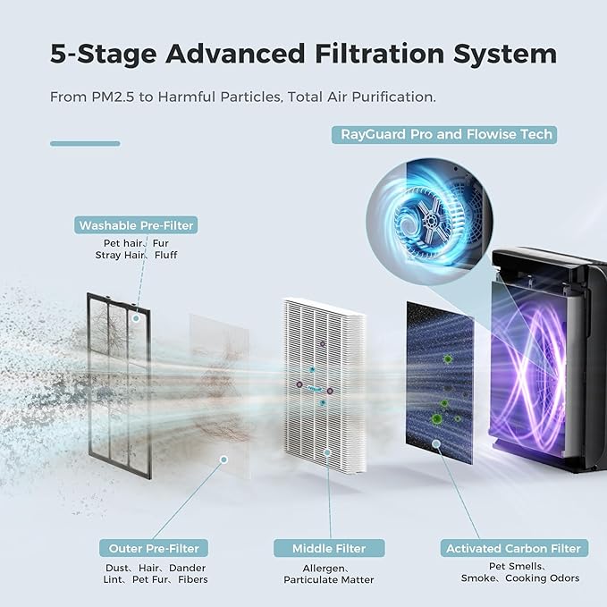 • Comprehensive Defense: This air purifiers, equipped with activated carbon, and a pre-filter, effectively removing particles and odors. The Filter captures pet dander and pollen, while activated carbon neutralizes odors, smoke. The washable filter included blocks pet hair, extending its lifespan for all-around purification