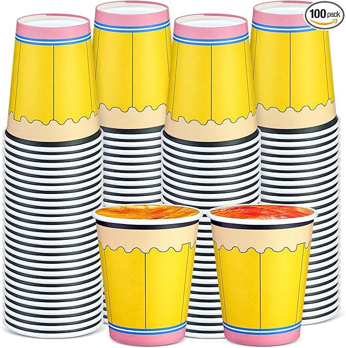 Funtery 100 Pieces Pencil Paper Cups Back to School Disposable Coffee Cups 9 Ounce Drinking Tea Paper Cups Pencil Cups for Daily Use Back to School Party