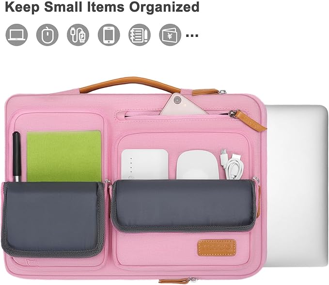 • 360 degree all around protective reinforced interior edge briefcase carrying case bag protect your laptop from any accidental dropping. Extendable handle design makes it to carry your laptop around in comfort, you can also tuck away the handle. Side opening zipper design, avoid accidental dropping of your laptop while carrying. 4 front zipper pockets provide enough space to keep mouse, earphone, pens and notepads, offering added convenience.