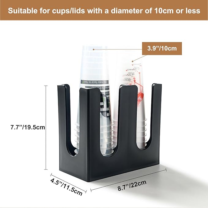 • 2 compartments size is 4.5" wide 8.7" length and 7.7" deep. Suitable for cups or lids with a diameter of 3.9"/10cm or less. The package contains 2 pcs Coffee Cup and Lid Holder.