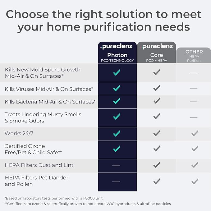 • ADVANCED MOLD DEFENSE – The Puraclenz Photon stops new mold spore growth in the air and on surfaces with a 99.75% success rate against candida albicans – the common cause of fungal infections – on surfaces. In addition, it reduces odors and mycotoxins, byproducts of mold, that can have long-term health effects by reducing new mold growth. *This product is designed as a preventative product and not for remediation.