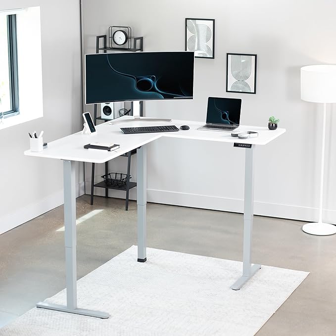 VIVO Electric Corner 63 x 55 inch L-Shaped Standing Desk, Memory Height Adjustment, White Top Gray Frame, DESK-E3CTGW