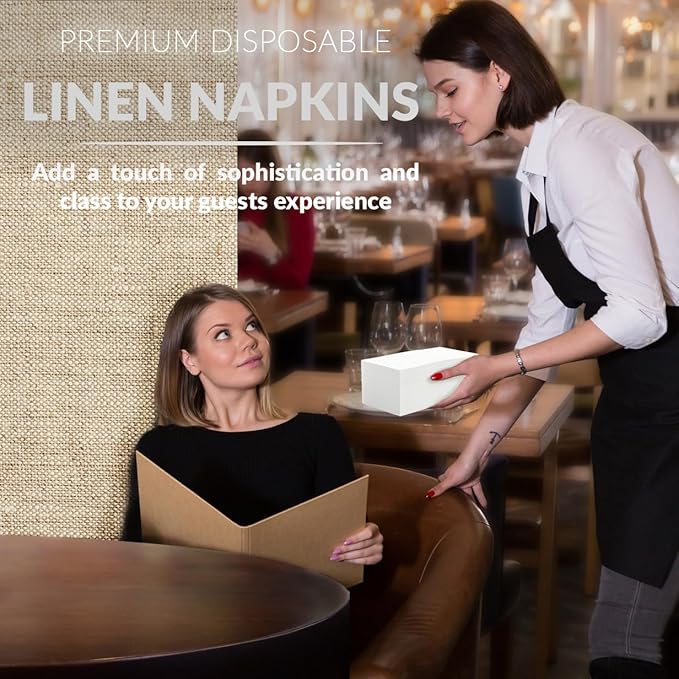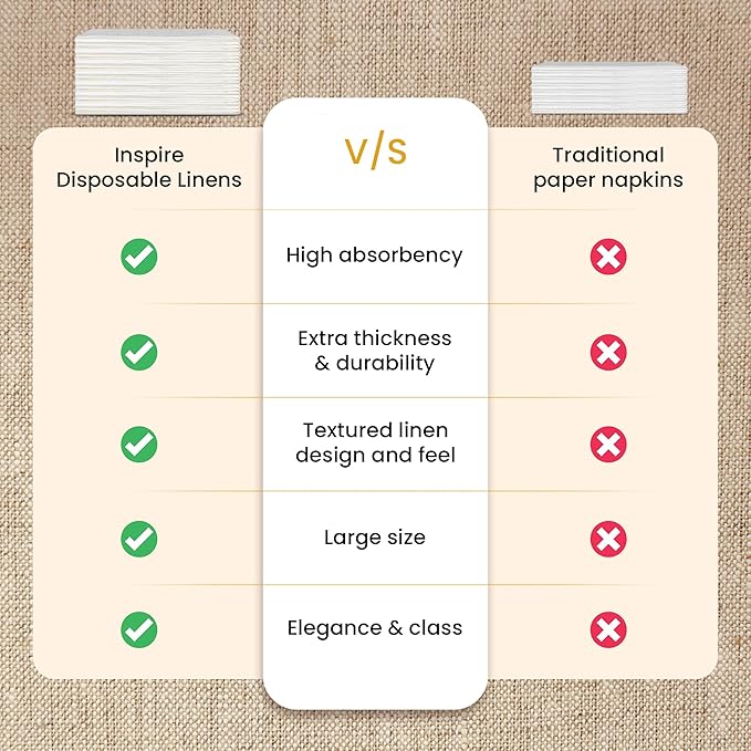 • AN ELEGANT TABLE SETTING WITH DISPOSABLE CONVENIENCE: Add a touch of elegance to your special dinner. Linen like in look and feel Inspire linens adds a touch of class to your table, making them ideal dinner napkins for any occasion. Thicker and larger than standard paper napkins. These decorative napkins look and feel like real linens but offer the convenience of being disposable for effortless clean up. Holiday dinners, party's, or as wedding napkins.
