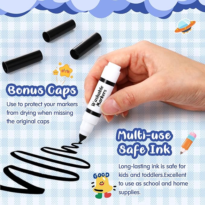 • Washable Formula: the ink of these broad line markers washes easily from skin, clothing, carpet or most fabrics, so you don't have to worry about your child staining their skin and clothing
