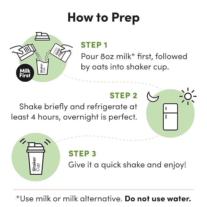 • ZERO MORNING PREP - Mix one pack of Oats Overnight with your choice of milk or milk alternative the night before and place in the fridge so you can grab and go in the morning. Ditch the spoon and enjoy this premium oatmeal directly from the shaker bottle (sold separately), perfect for your morning commute.