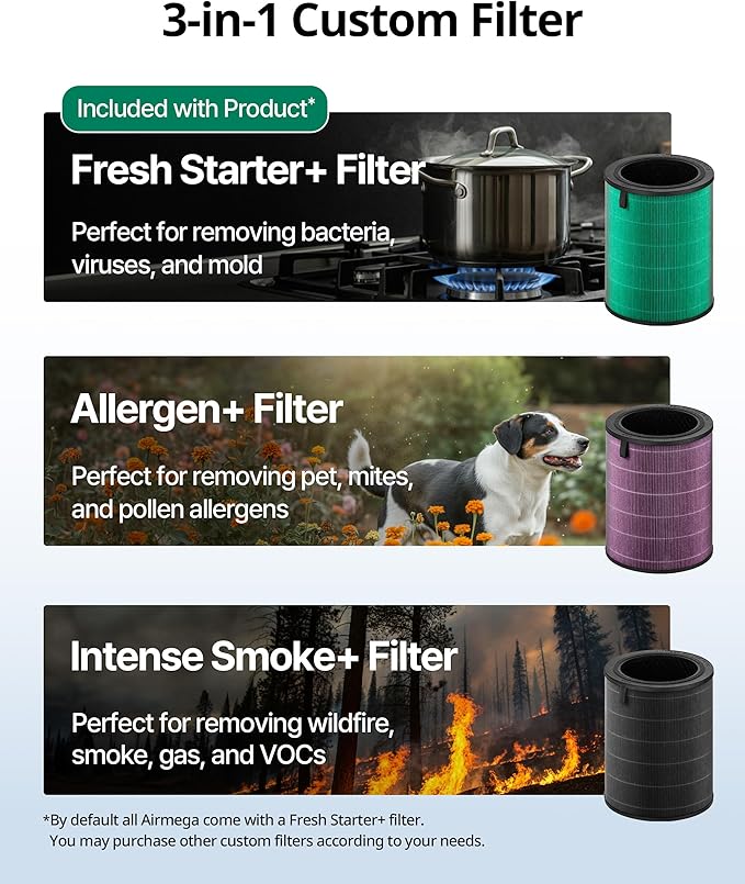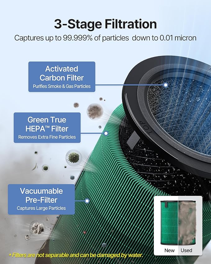 • Advanced 3-in-1 Filteration system combines a vacuumable pre-filter, activated carbon, and a True HEPA Filter effectively reduces up to 99.999% of particles down to 0.01 microns in the air, including pollen, pollutants and other allergens. It also reduces more than 99% of volatile organic compounds and reduces fumes such as NH3 and CH3CHO.