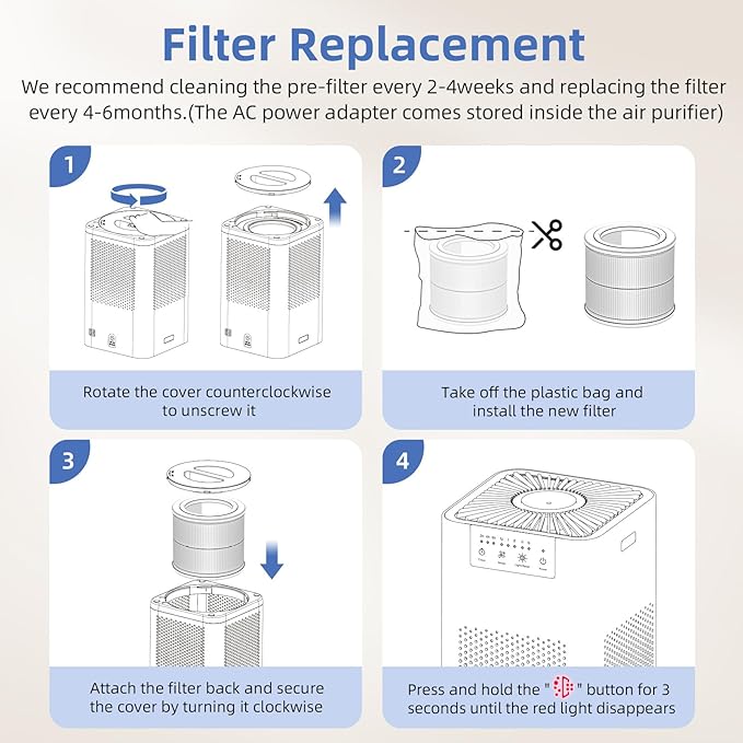 • REPLACEMENT FILTERS: AP100-RF - Basic air purifying filter (Search B0D9Q11D89); AP100-RF-PA - Pet-specific, absorbs odors & dander (Search B0D72V2QG3); AP100-RF-SR - Multi-functional, captures hair/pollen, eliminates odors & decomposes harmful gases (Search B0DP2BYRFP).