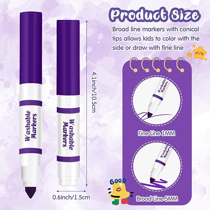 • Broad Line: the tip of the washable broad line markers features a tapered design; The side of the pen tip is nice for coloring large blank areas, while the tip is also suitable for drawing fine dots or lines
