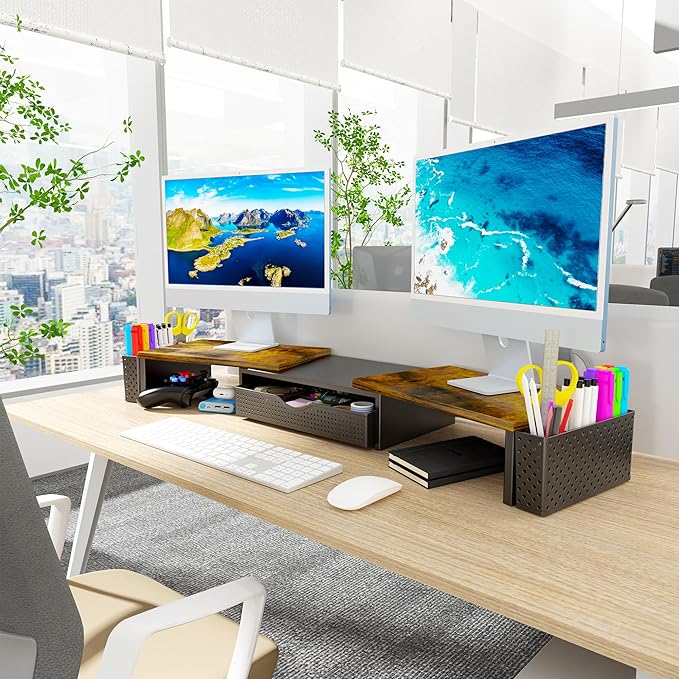 • Dual-screen office efficiency improvement: This desktop organizer is equipped with a dual-display stand, which can place two monitors at the same time, effectively expanding the workspace. It also has adjustable length (27.6-40.6 inches) and angle to provide you with a better viewing experience.