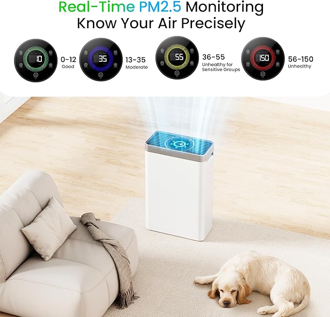 • REAL-TIME AIR QUALITY SENSOR-Monitor your air at a glance with the color-coded LED display. The auto mode adjusts fan speed based on detected air quality—no guesswork needed