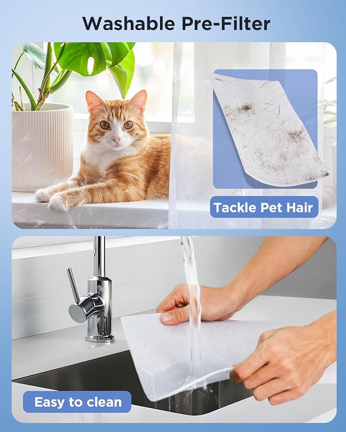 • AIR PURIFIER DESIGNED FOR PET LOVERS: This home pet air purifier is innovatively designed with the "Pet Mode". In this mode the increased purification effect helps capture pet hair and pee smell in the air faster, significantly improving indoor air quality and helping you and your Families enjoy cleaner air. You can also water clean the washable pre-filter to extend the life of the 4-stage filtration system and dry the shade before using the air purifiers for home pets again.
