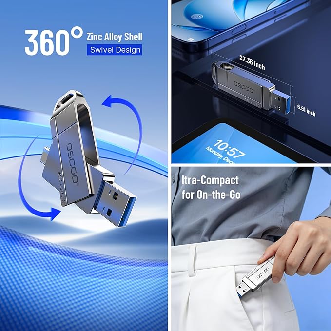 • [Dual USB-C + USB-A Design] Equipped with both USB Type-C and USB-A interfaces, this 2-in-1 flash drive offers wide compatibility with USB-C smartphones, Android tablets, laptops, desktops, car infotainment systems, smart TVs, and more