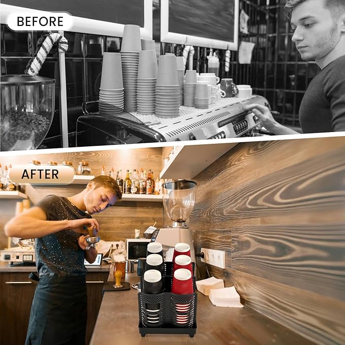 • SPACE-SAVING: This coffee cup holder organizes cups and lids, saves space and keeps the desktop clean and tidy. The coffee station organizer can also be used on cabinets, bathroom,breakroom, tea party and more. Organize your disposable cups with this cup organizer to free up more storage space for you