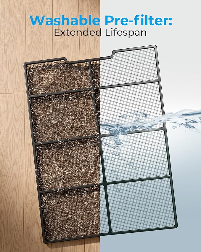 • 【Dual True H13 HEPA Filters】This air purifiers for home features a dual 3-stage filter system (washable pre-filter, activated carbon filter, and true HEPA filter) that doubles the filter's surface area. This design helps reduce particle buildup and clogging, plus extend the filter's lifespan. It effectively captures and removes up to 99.95% of airborne particles down to 0.1 microns, including pollen, pollutants, and other allergens.
