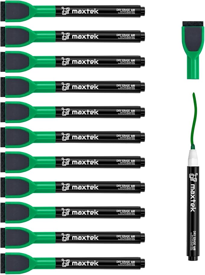 maxtek Magnetic Whiteboard Markers - 12 Count Green Fine Tip Dry Erase Markers with Eraser for Kids, Low Odor Thin Markers for Calendar Boards