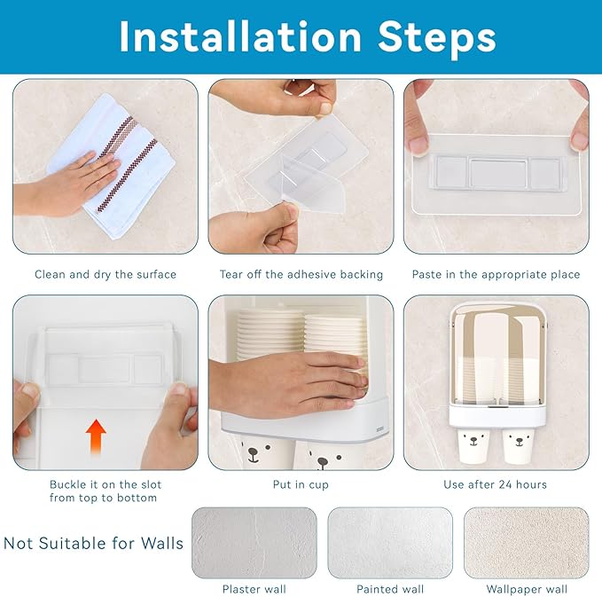 • No-Drill Mounting: EEKEDO cup dispenser comes with durable 3M adhesive, easy to install, no tools and no drilling required. Securely attaches to shelves, cabinets, water cooler, or walls without screws or damage.