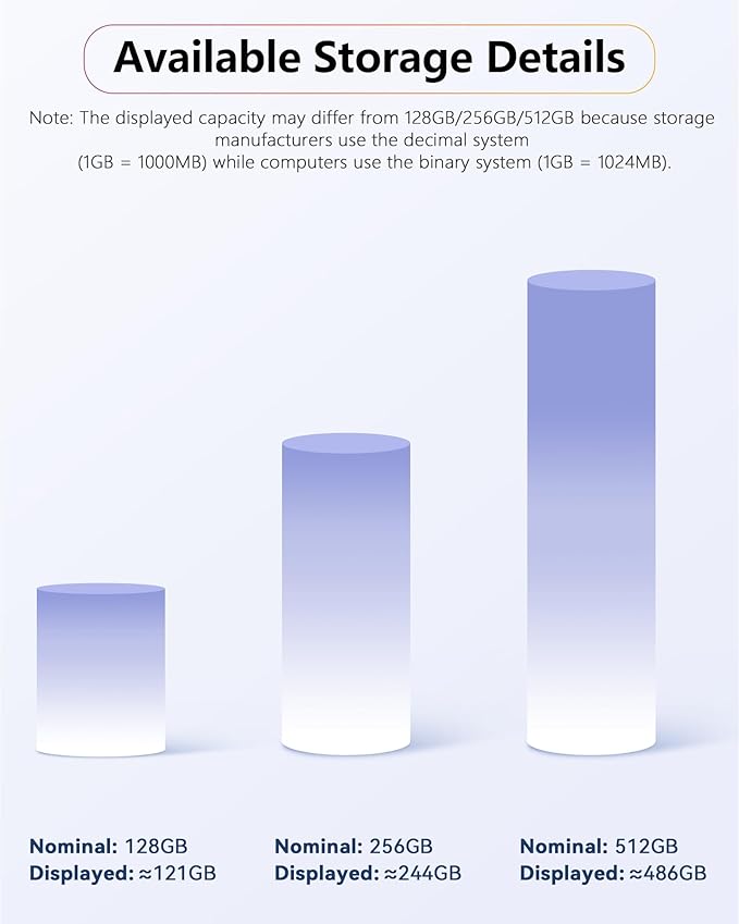 • Available Storage Details: The displayed capacity may differ from 128GB/256GB/512GB because storage manufacturers use the decimal system (1GB = 1000MB) while computers use the binary system (1GB = 1024MB).
