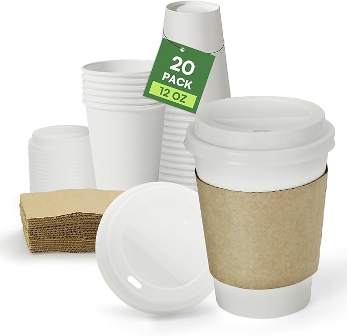 Paper Coffee Cups with Lids & Sleeves 12 oz Hot Cups, 20 Pack To Go Cups with Lids & Sleeves, BPA Free Unbleached Thickened Leak Proof White Paper Cups for Everyday Office Coffee Bar Supply Essentials