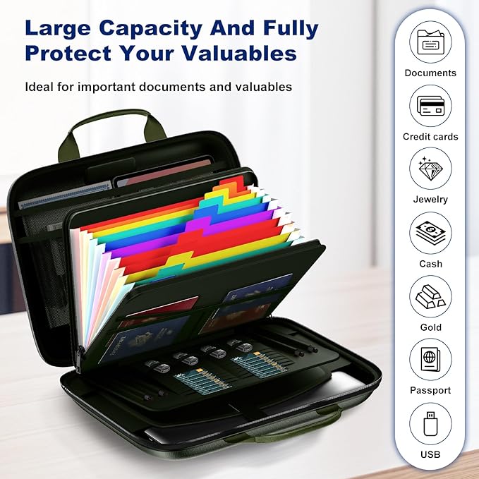 • Large Capacity & Portable: Fireproof File Organizer is designed with multi-layer space, external dimensions 16“ x 12.5” x 3"inch, accordion file 13 pockets, 1 main pocket, 1 zippered pocket, 4 pen slots, 14 card slots, 4 USB pockets, 4 passport pockets, 2 main mesh pockets. Large enough to keep your laptop, documents, certificates, money, passport, USB, pens, cards etc.