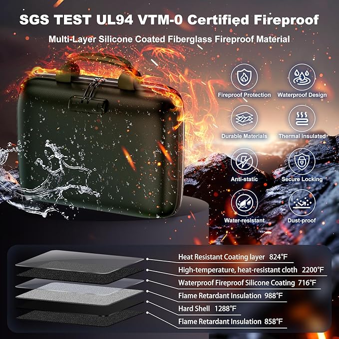 • UL-94 VTM-0 Certified Fireproof Box: HIBWN Fireproof document box is made of high quality flame retardant fiberglass, passed UL-94 VTM-0 professional fire resistance combustion test, with superb fire resistance. Surface used waterproof silicone coating, ensuring that your documents and valuables are protected in case of fire, flood or wet weather.