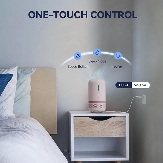 • 【ONE-BUTTON CONTROL】No need to adjust settings and knobs. This portable air purifier offers a simplied operation with one-button. Featuring a user-friendly one-button design, it offers three modes: on/off, speed button, and sleep mode. This air purifier combines effectiveness and convenience
