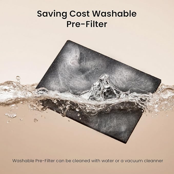 • Save 50% Costs on Filter: our replacement filters are divided into static pre-filter cotton and composite filter. Compare to Regular air purifier which has a max filter life of 3 months, our Replaceable Electrostatic Pre-filtered Cotton, which increases filter cartridge life from 3 months to 6 months, saving you 50% cost. (For filters, please search for B0DT6CWC1K Composite Filter or B0DT5RNTPV Pre-filter. Filter Dimensions: 1.0"Dx10.2"Wx11.3"H).