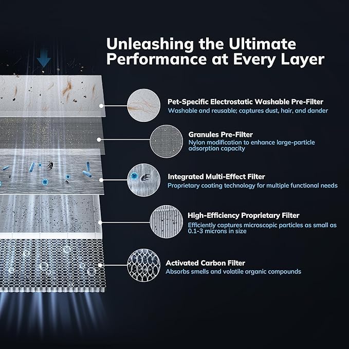 • 【Game-Changing All-in-One Multi-Effect Filter】Breaking the limits of single-function filters with a 5-layer (others only 2–3 layers) and extensive material testing. By integrating multi-effect materials, one filter delivers powerful performance—effectively removing dust, dander, pollen, wildfire smoke, VOCs, odors, and fine particles (independent lab tests on ISO 17025 standards),however, others only have a singular function and cannot handle diverse needs, utimately imposing additional burden