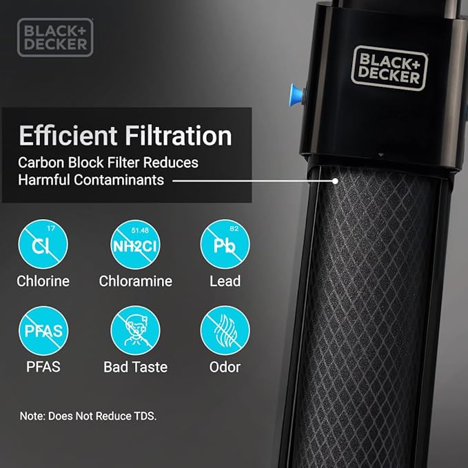 • EFFICIENTLY REDUCES 99% OF CHLORAMINE : Americans rely on chloramine-treated public water supplies and are at risk of unknowingly exposing themselves to harmful toxins. The Black+Decker undersink Water Filter for the kitchen is specifically designed to reduce 99.2% chloramine efficiently. If your tap water is chloramine-treated, the Black+Decker under sink water filter is the ideal solution.