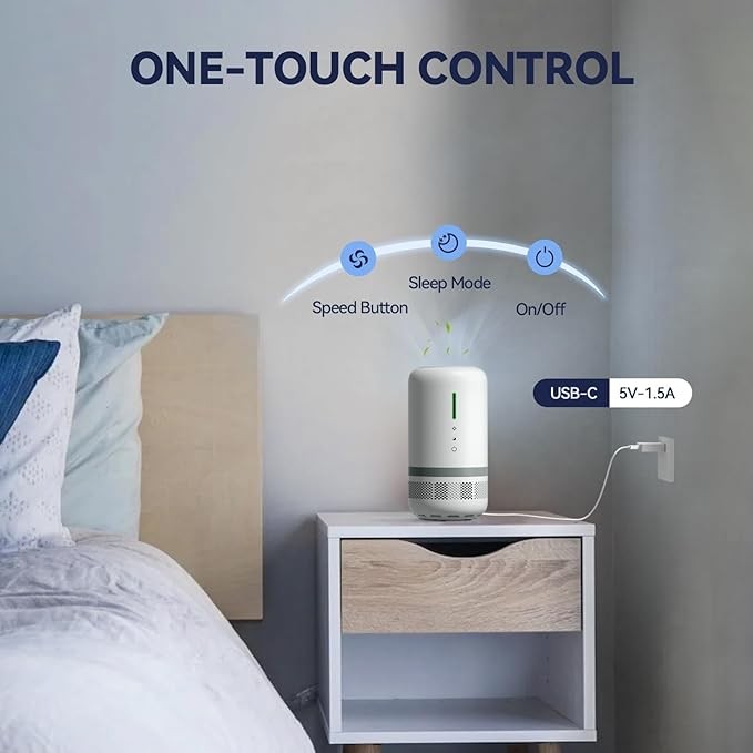 • 【ONE-BUTTON CONTROL】No need to adjust settings and knobs. This portable air purifier offers a simplied operation with one-button. Featuring a user-friendly one-button design, it offers three modes: on/off, speed button, and sleep mode. This air purifier combines effectiveness and convenience