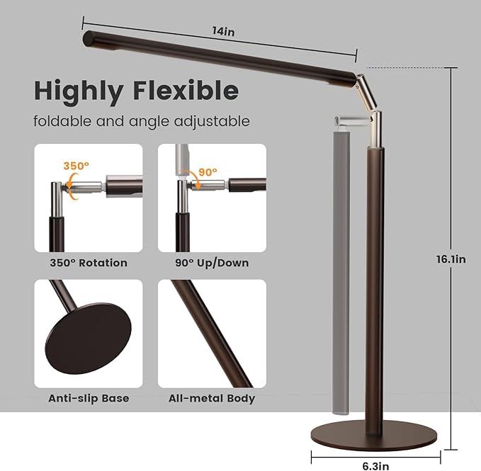 • 【Durable & Flexible】 This LED desk lamp, all-metal durable construcion; brown finish elevates desk aesthetics; 350° rotating head & 90° foldable arm, allowing you to adjust the light zone and space-saving storage.
