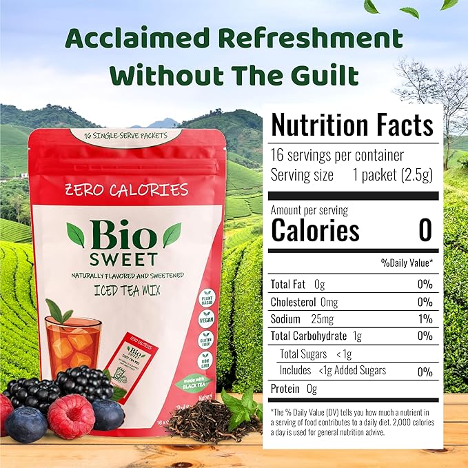 BioSweet Iced Tea Mixes - Red Berries Flavor | Zero Calorie Mix from Real Black Tea | Naturally Sweetened & Flavored | Non GMO, Gluten Free, Vegan (16 single-serve packets)