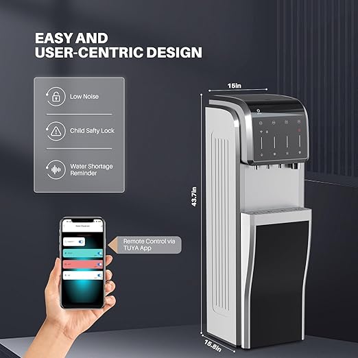 • Innovative and User-Centric Design--Loading a 1 to 5-gallon water bottle is a breeze with its bottom-loading design, eliminating the need for lifting or tilting. The unit's bottom door features a magnetic closure, and it offers remote control through the TUYA app for ultimate convenience. You can independently control hot, cold, room temperature water, and ice-making functions as needed.
