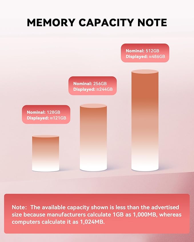 • Your Data, Under Your Control: Keep your sensitive files secure with the option to encrypt the entire drive or selected folders through the companion app. We stand behind our product—if you have any questions, our support team is always ready to assist. Note: The actual available capacity may vary from the labeled 256GB/512GB due to differences in how devices calculate storage (1GB = 1,000MB by manufacturers vs. 1GB = 1,024MB by operating systems).