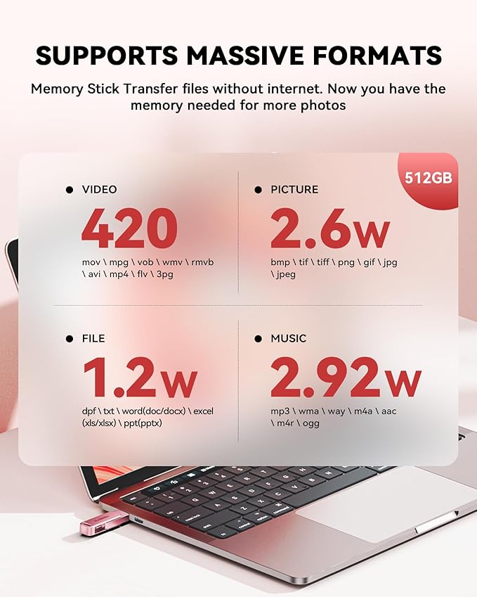BLANBOK+MFi Certified 512GB iPhone Photo Stick, USB Flash Drive for Photo/Video Backup, High-Speed Thumb Drive Compatible for iPhone/iPad/Android/PC (Pink)