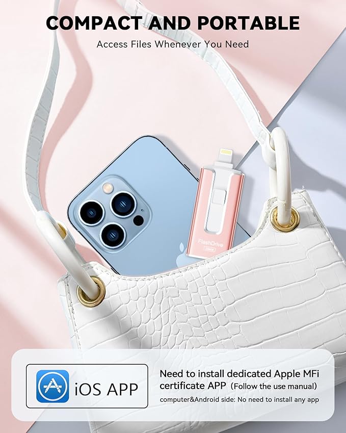 • 【Stylish, Portable, and Secure】With a compact and stylish design, this flash drive for iPhone is available in blue, pink, black and gold, making it easy to carry around. The built-in encryption option allows you to set a password via the APP to secure your personal files, photos and videos, ensuring you have peace of mind when storing and accessing your precious memories while traveling or for daily use.